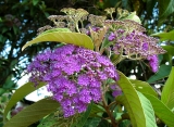 Inflorescências densas, globosas e terminais de cor roxas formadas de fevereiro a abril.