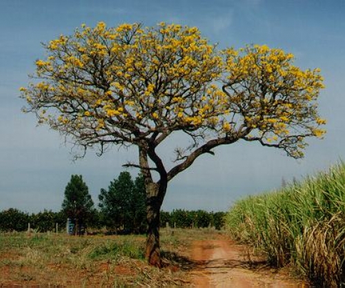 Tronco tortuoso. Possui folhagem decídua e folhas compostas e ásperas em ambas as faces. Floresce nos meses de agosto e setembro, com a planta totalmente despida de folhagem. As flores geralmente são tubulares e amarelas.